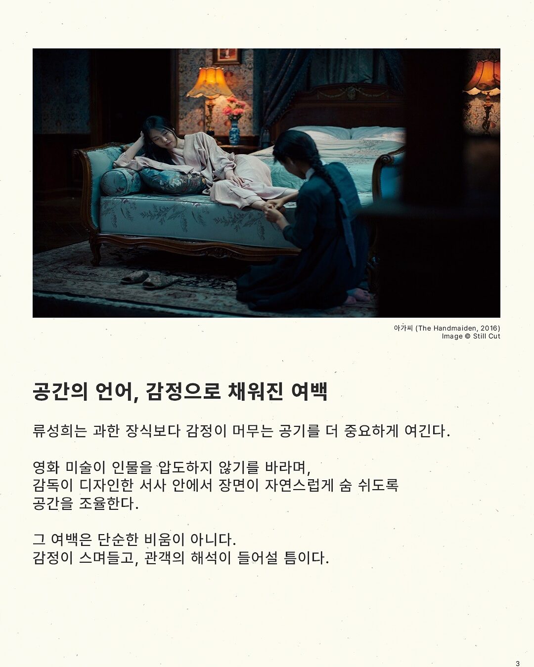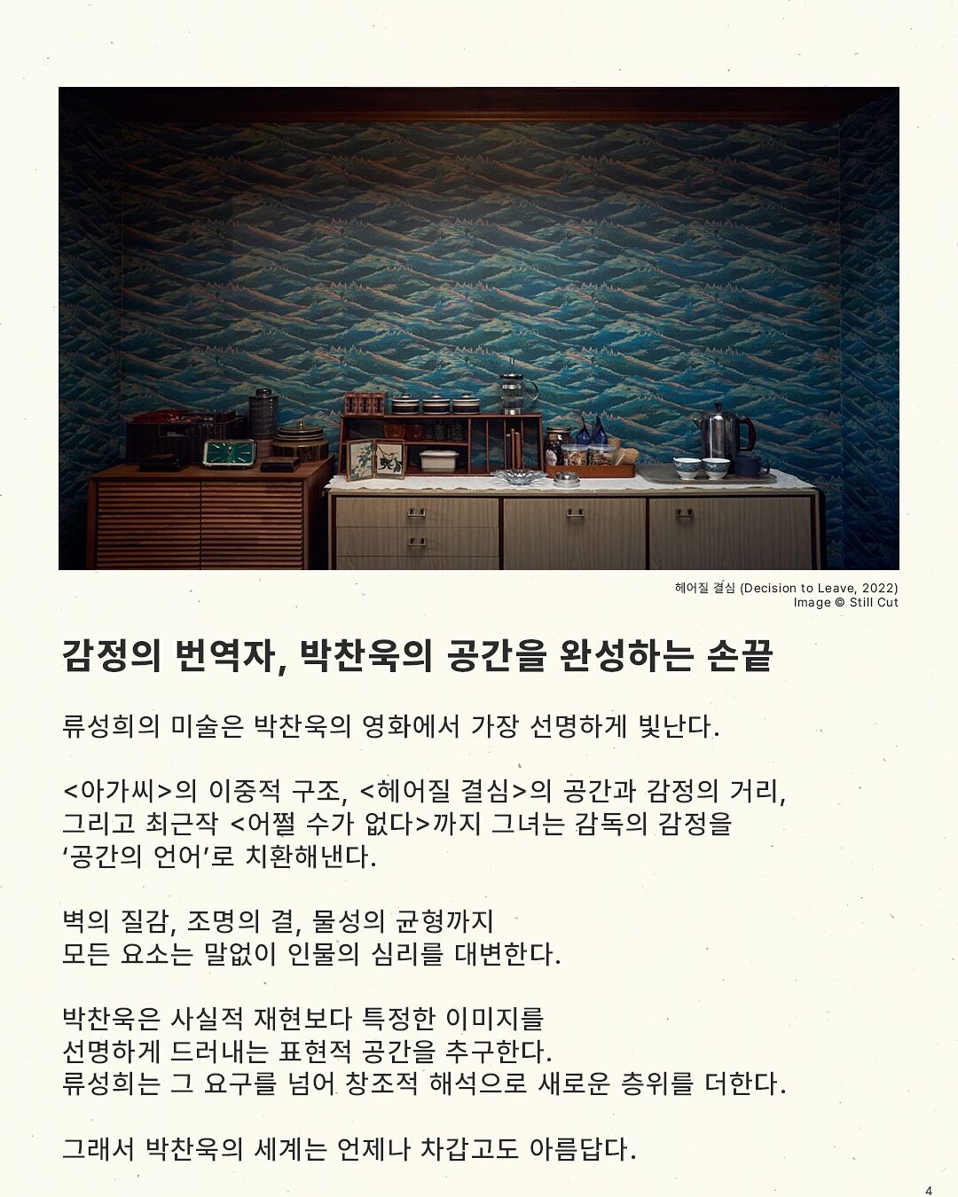 <아가씨>의 이중적 구조, <헤어질 결심>의 공간과 감정의 거리, 그리고 최근작 <어쩔 수가 없다> 까지 그녀는 감독의 감정을 ’공간의 언어‘로 치환해낸다.