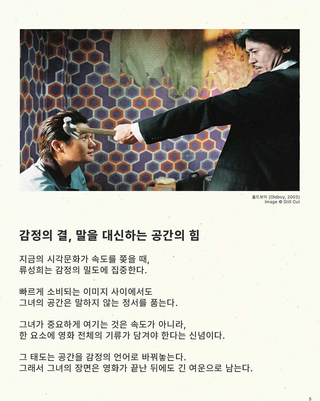 류성희는 그 요구를 넘어 창조적 해석으로 새로운 층위를 더한다. 그래서 박찬욱의 세계는 언제나 차갑고도 아름답다.
