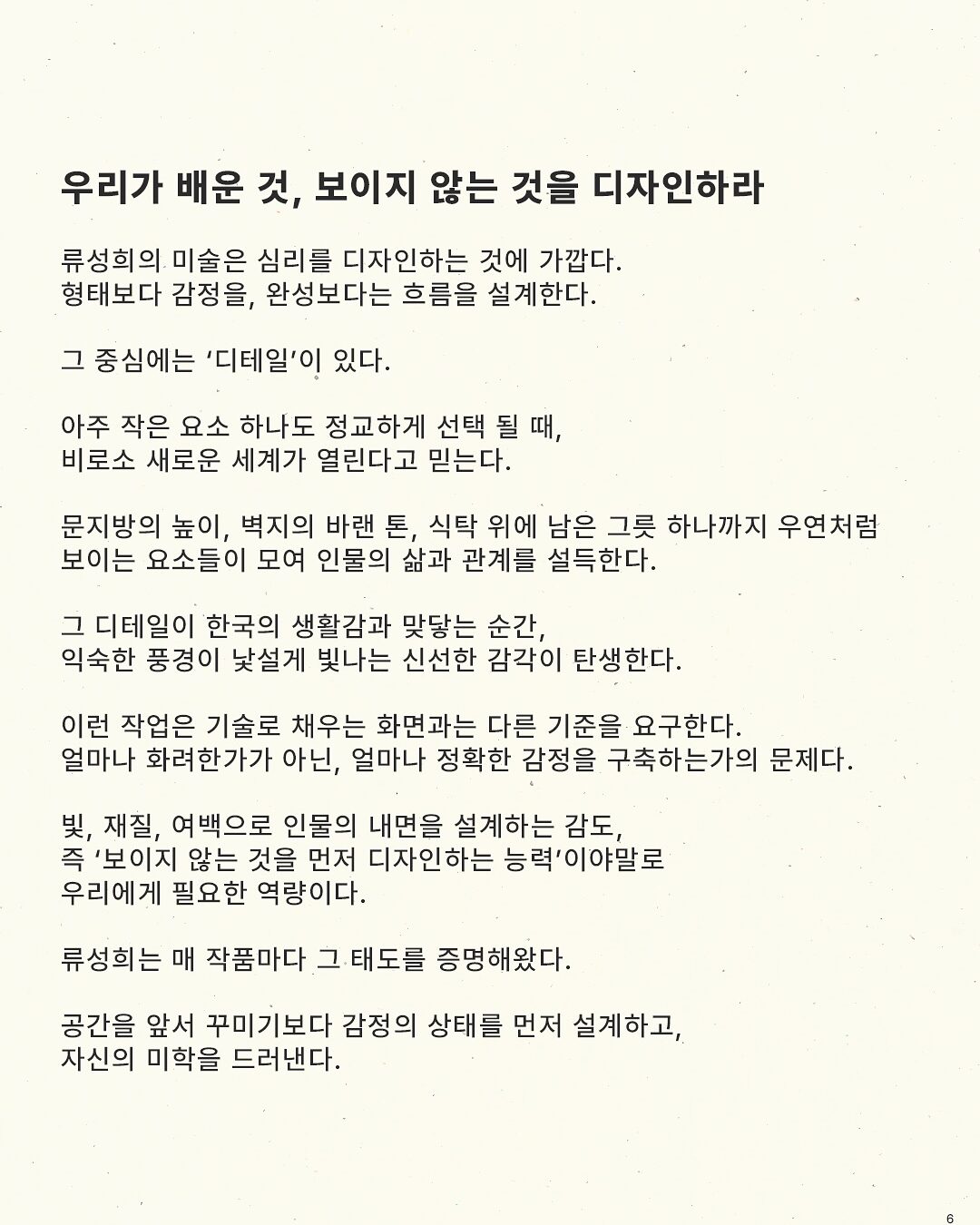 빛, 재질, 여백으로 인물의 내면을 설계하는 감도, 즉 ’보이지 않는 것을 먼저 디자인하는 능력‘이야말로 우리에게 필요한 역량이다.