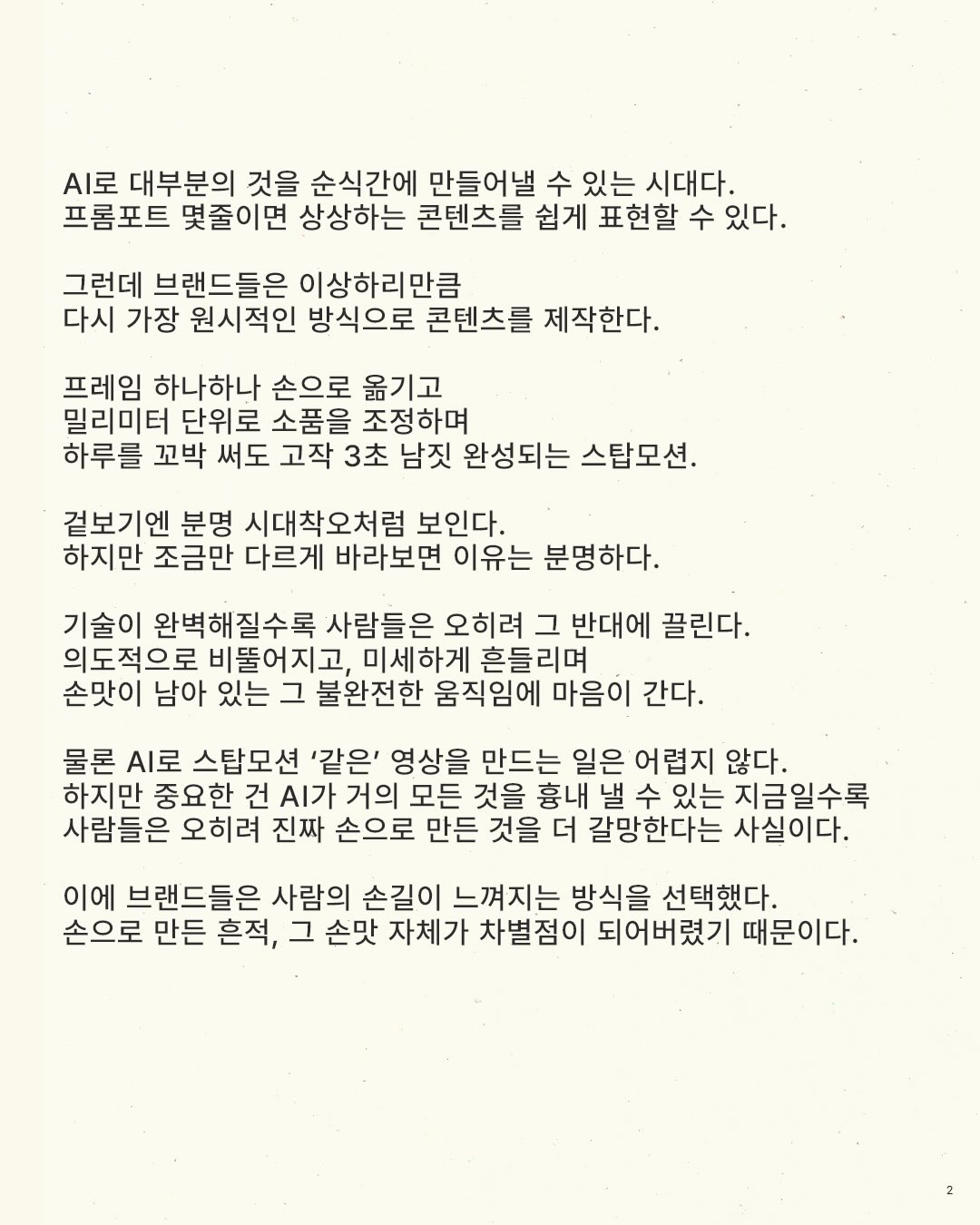 결국 기술의 과잉 시대에 스탑모션은 다시 새로운 형식이 된다. 디지털로 완벽하게 구현 가능한 모든 것이 서로 비슷해지는 순간, 불완전한 움직임은 경쟁력이 되고, 사람의 흔적은 브랜드 아이덴티티가 된다.